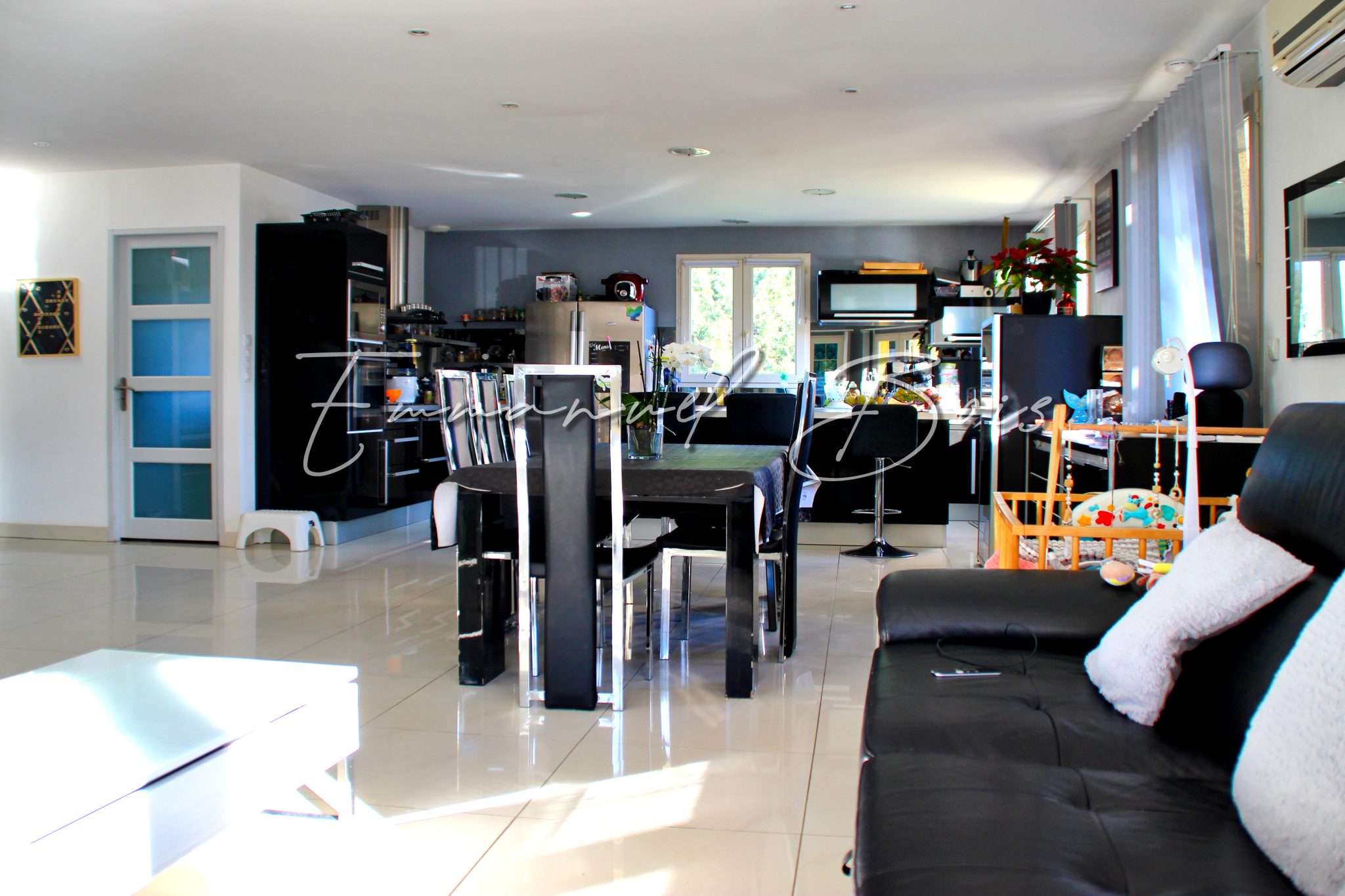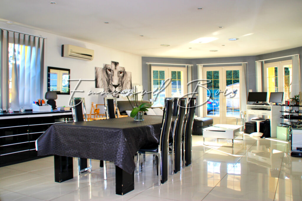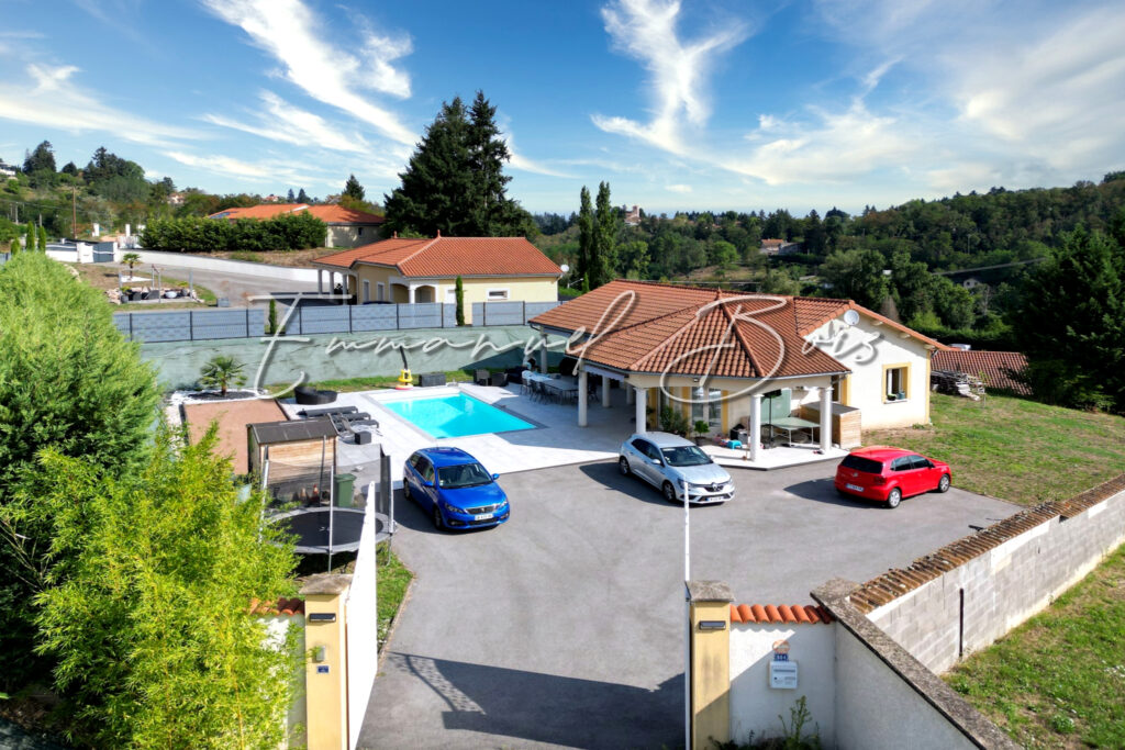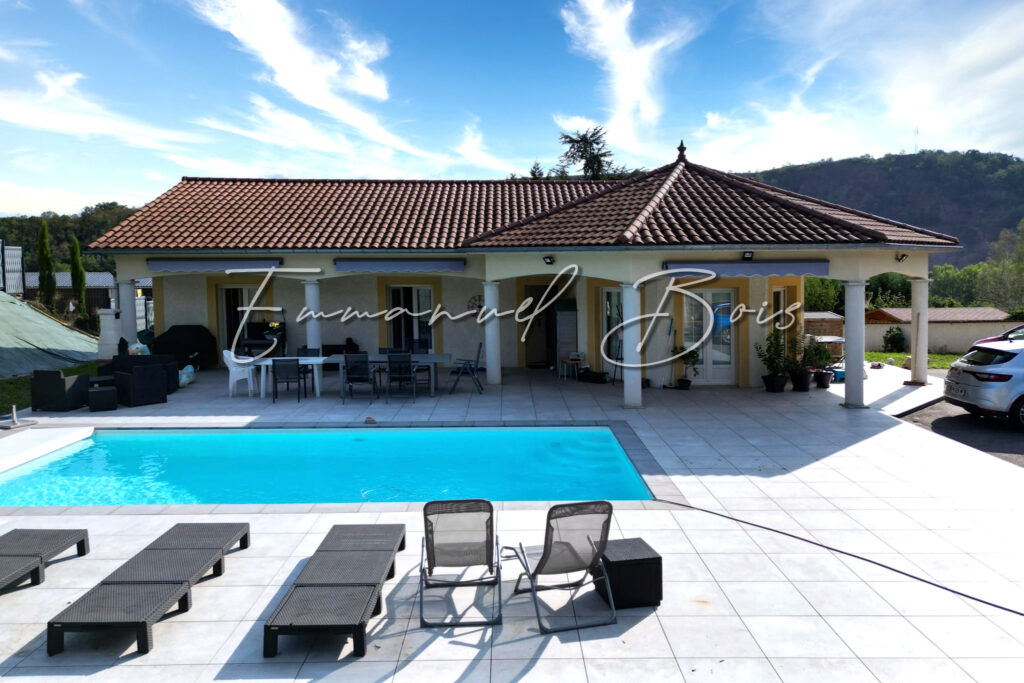 Exclusivité. Villerest, secteur prisé du Roannais, maison indépendante de Plain Pied de 2009 comprenant 1 salon salle à manger spacieux, 1 cuisine ouverte avec ilot, 3 chambres, 1 salle de bain et 1 WC pour une superficie d’environ 115 m2 habitables sur une parcelle de terrain clôturé de 1700 m2. Belle prestation disposant d’une grande terrasse dallée plein Sud. Piscine de construction traditionnelle 8×4, chauffée. Filration par électrolyse au sel. Douche et pompe solaire. Les +: construction récente, pièce de vie climatisée (PAC réversible), maison lumineuse, cuisine équipée et aménagée, belle prestation sans travaux à prévoir.